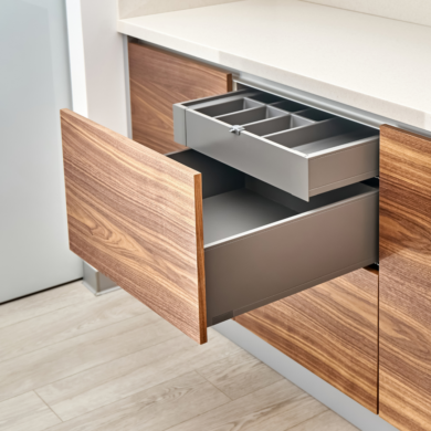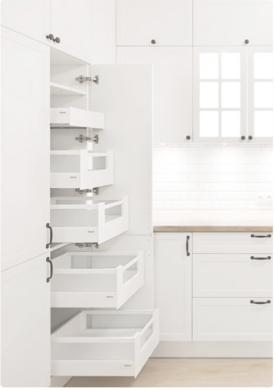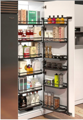 Това са уникални рафтове, които се плъзгат напред при отваряне на шкафа и се прибират при затваряне. Благодарение на това дори най-дълбоките кътчета на шкафа стават лесно достъпни, а търсенето в съдържанието на кухненските шкафове става много по-ефективно и удобно.