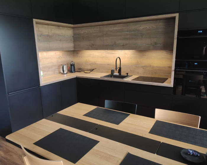 От друга страна, това решение е много ергономично, тъй като запазва много място в помещението. От друга страна, това спомага за лесното организиране на електрически, водни и газови инсталации, тъй като всички те са разположени на една стена.