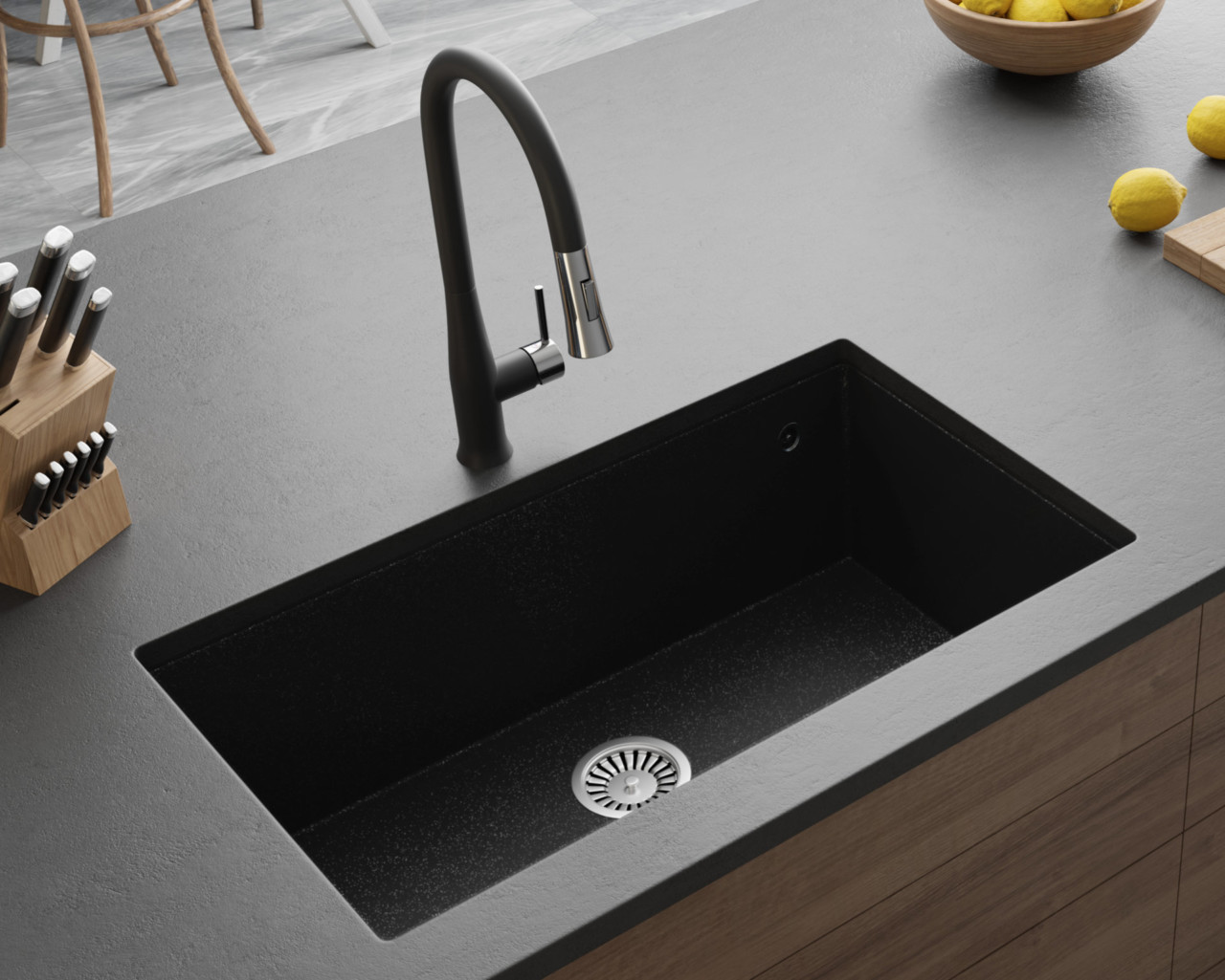 И преди всичко, нашите мивки са изработени от гранит, благодарение на което кухнята се превръща в място, изпълнено с тишина и спокойствие. Този материал има такива свойства, че абсорбира звуците много по-добре от стоманения материал. Следователно ще бъде не само удобно, но и приятно. Благодарение на което такова място ще бъде по-привлекателно за извършване на ежедневни домакински задължения.